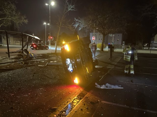 Über 90.000 Euro Schaden: Mercedes überschlägt sich und kollidiert mit Bushaltestelle, Offenbach - Ein heftiger Verkehrsunfall hat sich am frühen Freitagmorgen in der Mühlheimer Straße an der Ecke zur Ulmenstraße zugetragen. Nach ersten Erkenntnissen der Polizei war ein 24-Jähriger kurz vor 4 Uhr mit seinem Mercedes von Offenbach kommend in Richtung Mühlheim unterwegs, als er beim Abbiegen nach rechts in die Ulmenstraße offenbar die Kontrolle über seinen Wagen verlor.