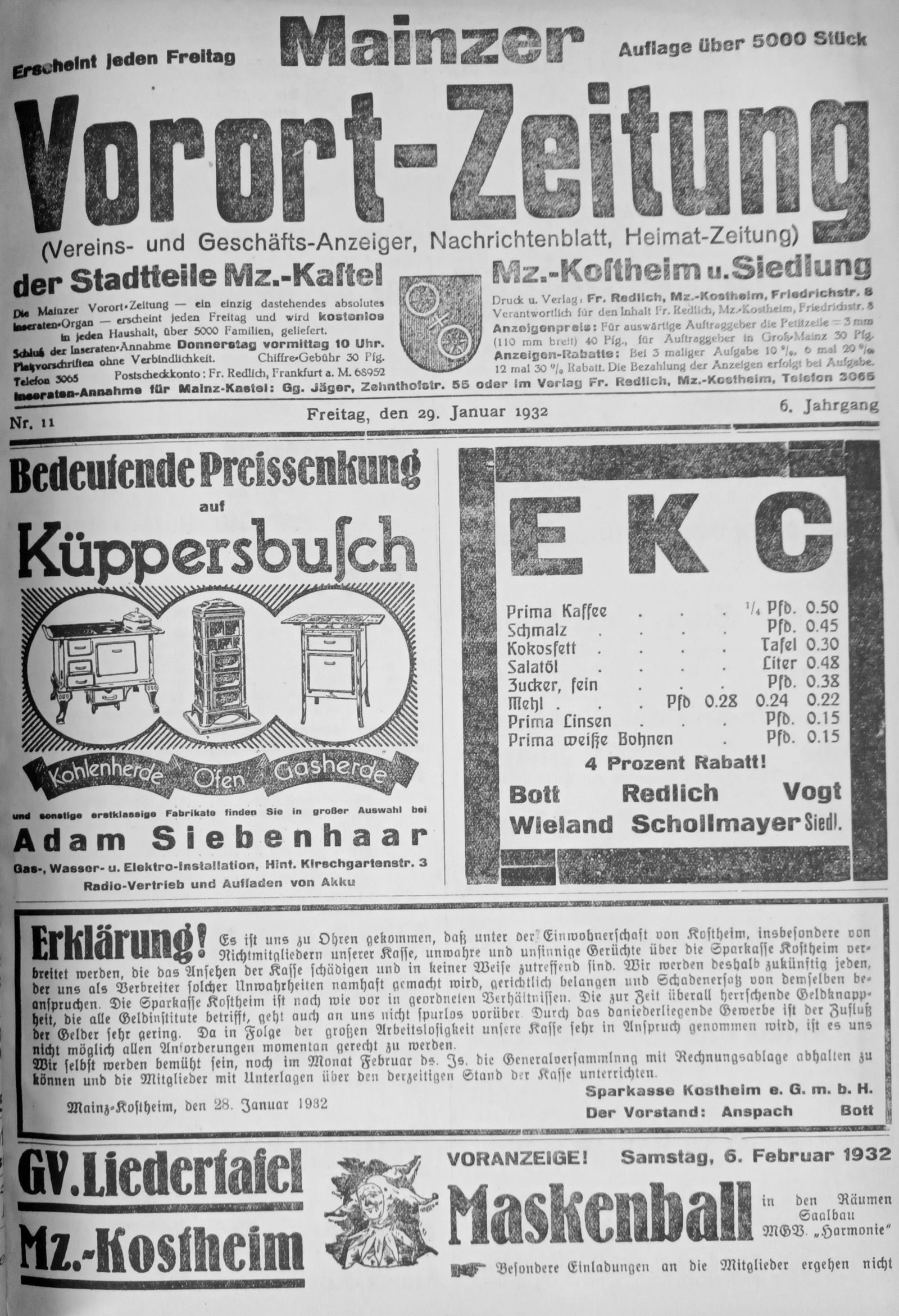 Die Zeitung wurde herausgegeben von Druckerei Redlich Kostheim Friedrichstr.8, hatte eine Auflage von über 5000 Stück und wurde kostenlos an alle Haushalte verteilt. Die Erste Ausgabe erschien am Donnerstag den 25. November 1925 noch als Nachrichtenblatt des Stadtteils Mainz-Kostheim und der Gemeinde Gustavsburg. Ab dem 10. Dezember 1925 wurden die weiteren Ausgaben statt Donnerstag am Freitag verbreitet. Darüber gibt es demnächst noch mehr.....Ralf Jost PresseMainz.de