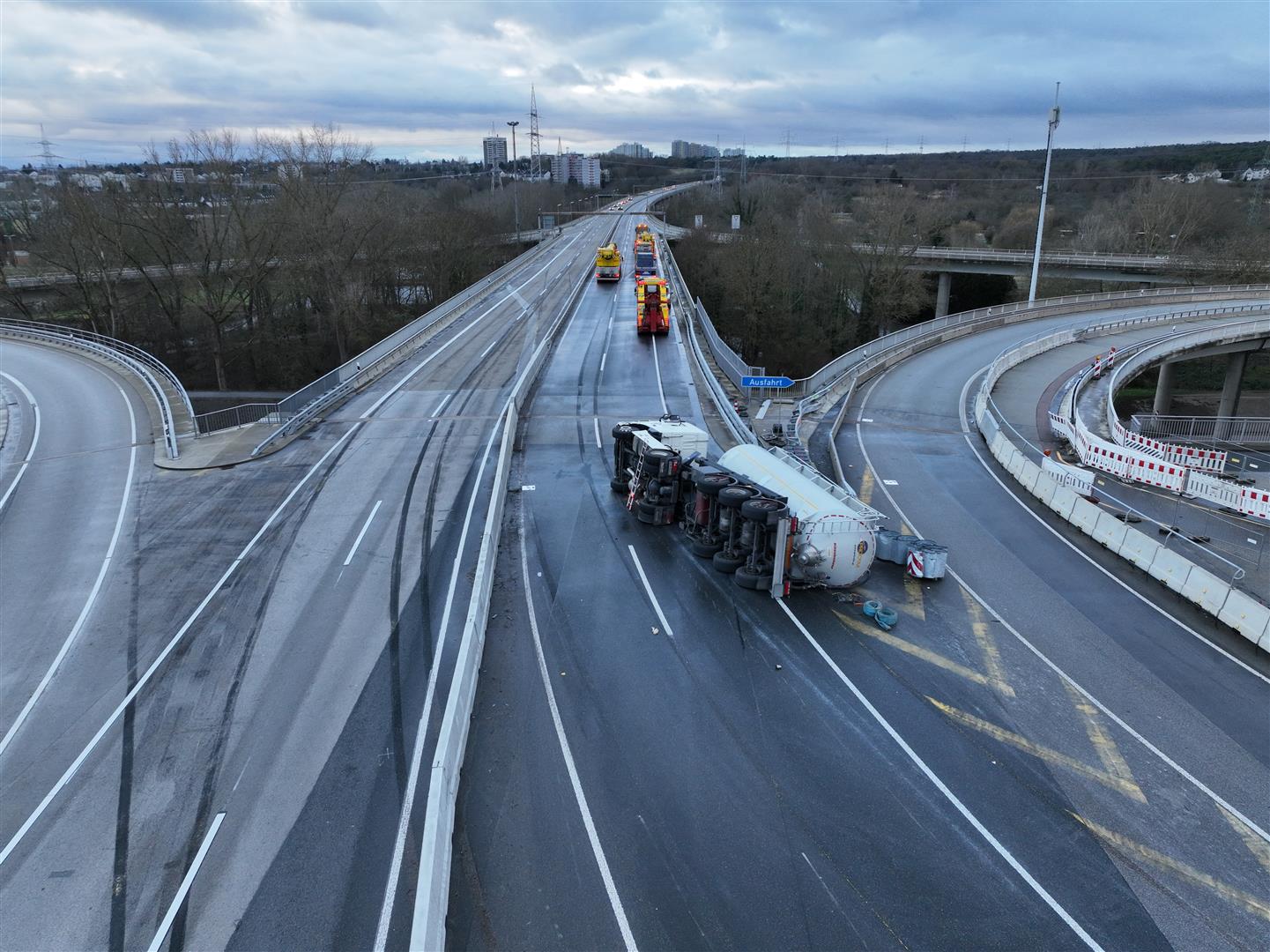 Ein mit Zement beladenes Silofahrzeug kam aus bislang noch ungeklärten Umständen in der Ausfädelungsspur der Anschlussstelle nach rechts von der Fahrbahn ab und touchierte die dortige Betongleitwand. Anschließend prallte das Fahrzeug gegen den Anfahrschutz zwischen der Hauptfahrbahn und dem Ausfädelungsstreifen, kippte auf die Beifahrerseite und blieb auf dem rechten von zwei Fahrstreifen liegen.