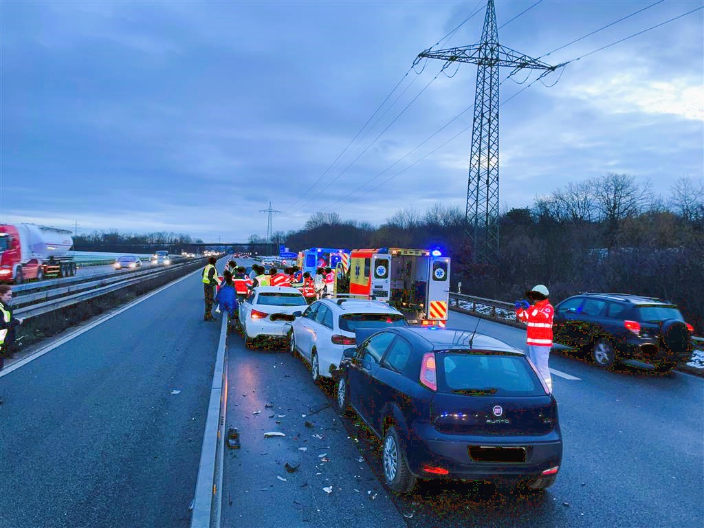 Insgesamt 7 Insassen der Fahrzeuge waren leicht verletzt. Die Richtungsfahrbahn Darmstadt wurde gesperrt. Der Verkehr konnte über die Abfahrt Ingelheim-Ost abgeleitet werden. Trotzdem kam es zu erheblichem Rückstau. Nach ersten Ermittlungen kam es zu einem Auffahrunfall mit drei beteiligten Fahrzeugen. Zwei weitere Fahrzeuge fuhren anschließend auf die verunfallten Fahrzeuge auf. Feuerwehr und Rettungsdienst waren mit mehreren Fahrzeugen im Einsatz. 5 Personen wurden zur weiteren Behandlung in umliegende Krankenhäuser verbracht. 3 Fahrzeuge mussten abgeschleppt werden. Gegen 09:20 Uhr wurde die Fahrbahn wieder freigegeben.