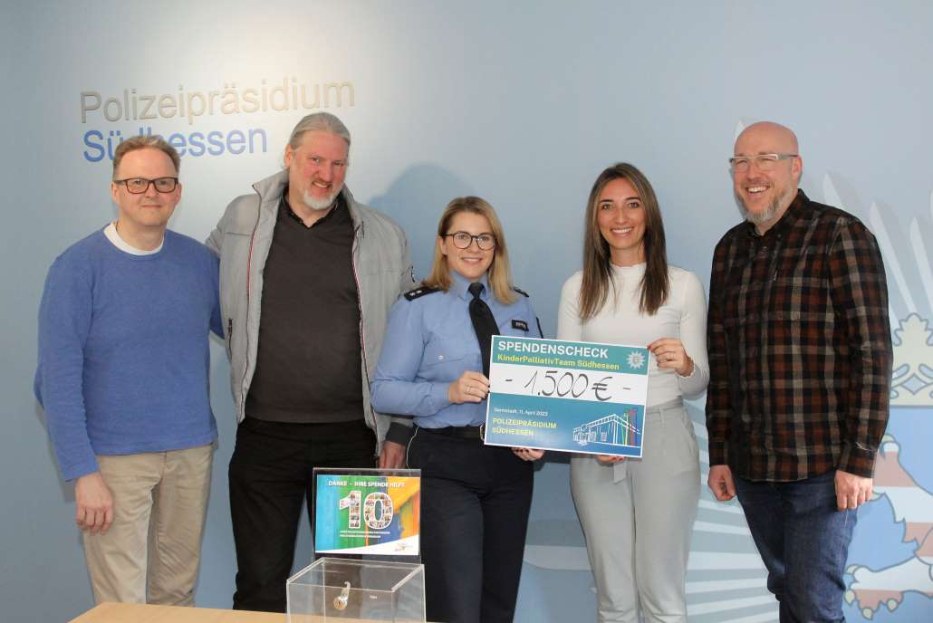 Spendenübergabe an das KinderPalliativTeam Südhessen, Polizeipräsidium Südhessen spendet 1.500 Euro, Darmstadt/Südhessen - Mit einer Spende in Höhe von 1.500 Euro unterstützt das Polizeipräsidium Südhessen die wichtige Arbeit des KinderPalliativTeams in Südhessen. Bei einer vorweihnachtlichen Kalenderaktion im Dezember 2022 spendeten Mitarbeiterinnen und Mitarbeiter des Polizeipräsidiums 500 Euro.